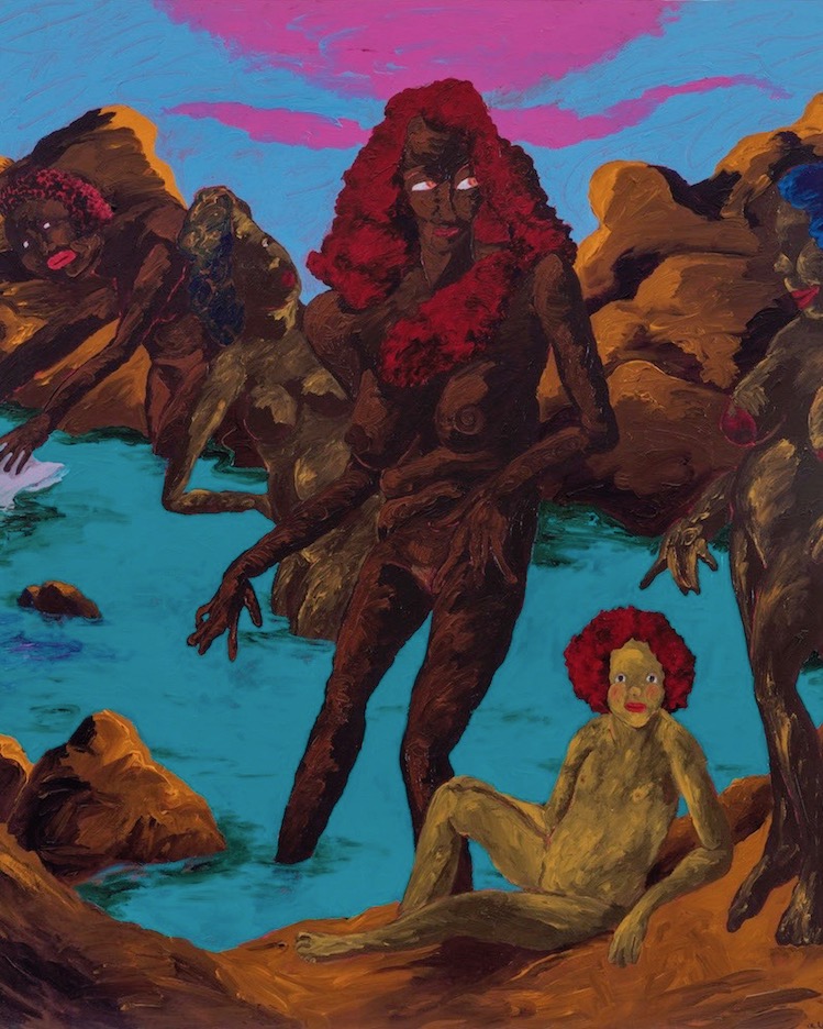 Meanwhile, Colescott’s subjects are depicted as strong yet peaceful protagonists blissfully frolicking on a rocky shore. This series challenges the notion that beauty is reserved for white women as he inverts the age-old seductive yet elegant female bather trope. Art historians believe the subject of the bather first emerged during the Renaissance as a way to depict Aphrodite, the goddess of sacred and profane love. Italian painter Sandro Botticelli famously depicted her emerging from a clamshell after being born at sea in The Birth of Venus (1486). Nude yet innocent and lovely, she is hailed as the embodiment of classical beauty. In Colescott’s Ancient Goddesses and the Contest for Classic Purity from 1985, the artist presents five nude bathers of bronze and golden skin wading in azure waters. The central figure’s flaming red eyes and hair recall the distinctive features of Yemoja, an African river goddess comparable to Venus.