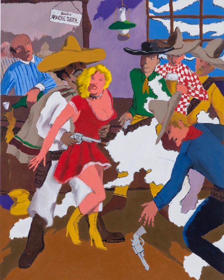 Organized thematically, this poignant and witty collection divides Colescott’s nearly sixty-year career into four distinct and significant categories. The first of which centers around notions of hedonism and societal inequality. Painted in the mid-1970s, these nine large-scale works on canvas immediately entice the eye and delve into the triumphs and tragedies of American culture with an emphasis on patriotism, cowboys, sex, and racial stereotypes.