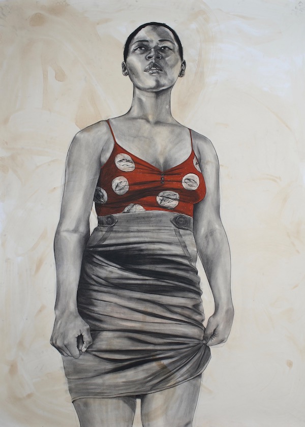 And amidst all of this, Pruitt’s monumental black, red, and white graphite portraits on paper imbue the show with a strong sense of humanistic connection. In many ways, they are the strongest component of the show, not only because these larger-than-life portraits are positioned regularly throughout the room, but also because of the way that the subjects pull you in, with their eyes, gestures, stature, and presence. While almost none of the sitters look directly at the viewer, Pruitt has painted all so that they are fiercely present.