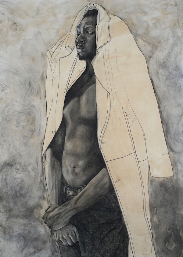 In I Turned Myself into Myself (2018), you see a figure emerge from a series of gestural lines — as if looking from an almost-aerial perspective at the figure lying in bed. Only certain elements are detailed with charcoal shading — a foot sticking out of the sheets, a hand holding a comic book (the only item in color), and a head, emerging from a web of lines spun to indicate the body in bed under the suggestive lines of sheets. Works like this are magnetic and compelling. The title in combination with the work suggest the transformative nature of sleep, our healing subconscious, and the rebirth of each new day.