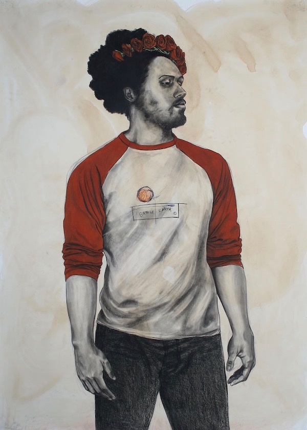 In Creator and Redeemer (2016), Pruitt depicts two women, one with her tattooed back facing viewers. At first glance, the tattoo’s mandorla-shape surrounding a female figure suggests Our Lady of Guadalupe, but instead the woman featured at the center is Harriet Tubman. And in Supreme Lover (2017), Pruitt depicts a young man with multiple pop culture references. With the title, he references John Coltrane’s album Love Supreme, and with the man’s accessories, he references Jesus Christ’s crown of thorns (embodied in a red rose crown) while his shirt depicts Birth of Earth, a Jean-Michel Basquiat drawing. Layered references like this are scattered throughout the show. Through them, Pruitt explores pop culture, Black culture, and religious imagery together as one unified and contemporaneous topic.
