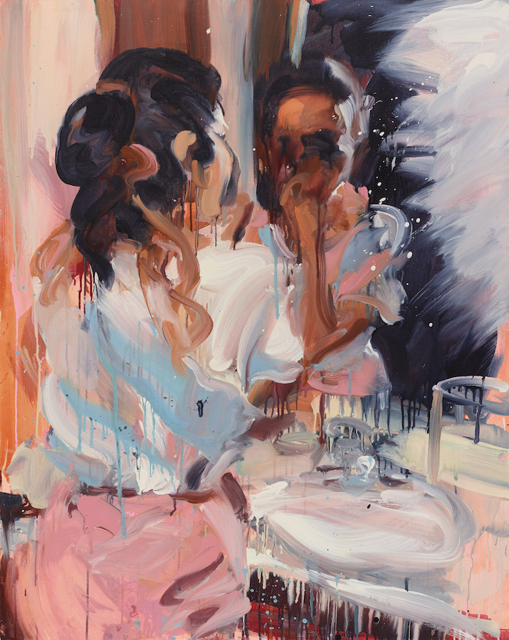 A similar image is depicted in Spectre, in which a woman views her reflection in a mirror above a bathroom sink. The sink itself seems to be dripping, white and ghostly, melting like wax. Her face is almost entirely obscured with abstraction, the mirror here is glancing back at us like a blind eye. The pink and white of the woman’s attire and the sink and counter itself bloom like pale flowers in a dim moonlight. Her arm is raised as if to apply lipstick, but we cannot see the result, she, too is dissolving.