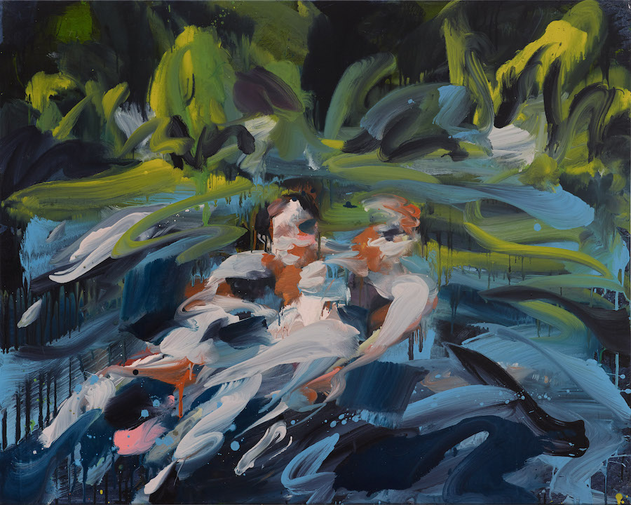 With Untitled, two pale and nymph like shapes with orange-brown hair – one could be the reflection of the other – float or dance through a dark blue and black sea. We can sense the motion, the turbulence in this body of water. Surely, this must be the sea rather than a pool – and beyond it are leafy, bright green trees, obscured but recognizable, the color exuding and even reflecting light. Beyond the trees is the blackness of a void. We are awash in, perhaps kept within, a dream-like landscape. Beyond it, should we seek escape, we cannot.