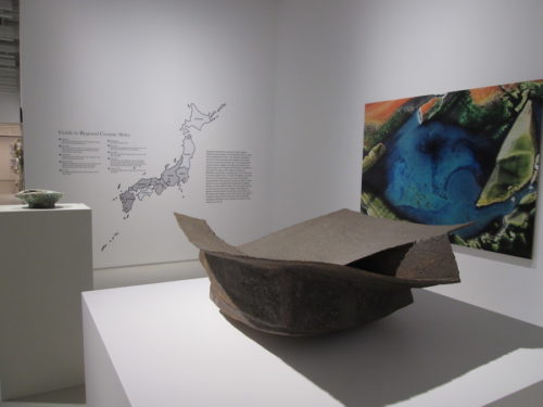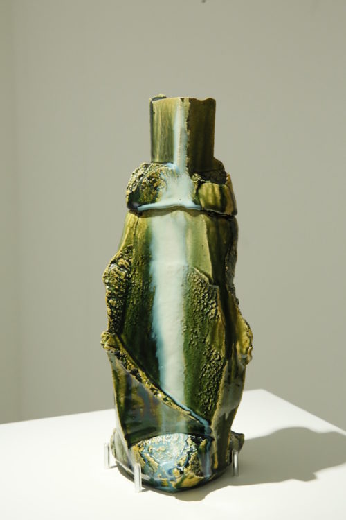 Senses of nature throughout the show are anchored in geographic locales. Wall labels and maps guide visitors from west to east around Japan’s key ceramic regions, with groups of exemplary pieces providing visual testament to the diverse effects of different areas’ clay chemistries, ancient kiln sites, ceramic styles, and traditional techniques. Quotes by Brodfuehrer offer insight into how certain artists may have been influenced by their surrounding terrain. For instance, one can readily comprehend the two disjunctive umber shards in Yukiya Izumita’s Sekakai Vase as a craggy fault inspired by “living in an earthquake-ravaged area”; and imagine rippled drips of jade glaze on a pair of oversized plates as “tree-covered hills and agricultural valleys of Kyushu.”