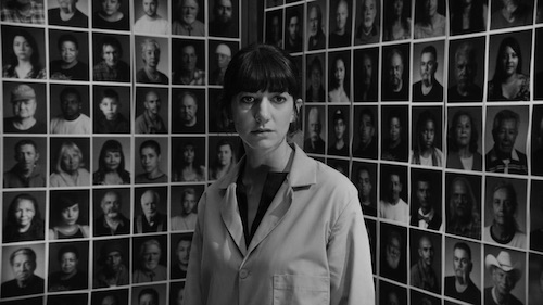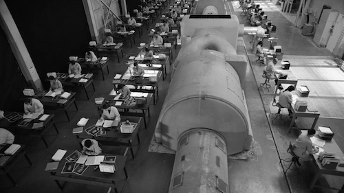 The Colony workers wear identical white lab coats, examining documents and photographs at desks in serried ranks extending to such length that we can barely see where they end. These workstations evince the madness of infinite replication, like the insanity of a single sentence typed a thousand times. In Kubrick’s movie The Shining, Jack Nicholson types “All work and no play makes Jack a dull boy” onto hundreds of sheets of paper, pretending to his wife that he is writing a novel. Her discovery of his “manuscript” is the movie’s true climax, a horror more disturbing than the visions of blood flooding the hotel corridors; or the murderous snowmobile chase through a frozen maze. Jack’s nonsensical document opens the portal to Hell.