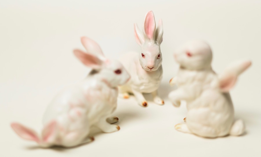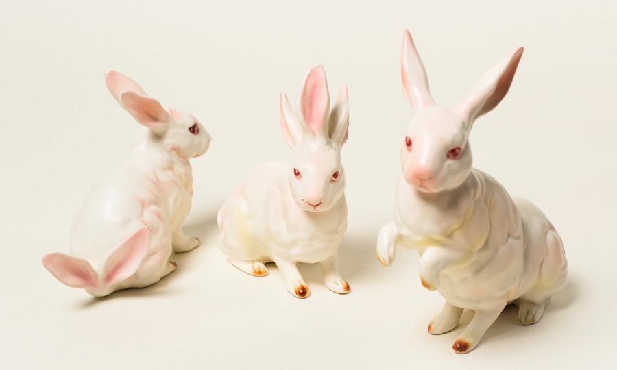 With white rabbit figurines as her sculptural templet, she says she wanted to test how many adjustments she could make “before the form would lose its ‘rabbitness,’” she explains. “Somehow, they all remain rabbits even as they are changed. I like this ability of the original object to remain what it is, while simultaneously having become vastly different from how it began.”