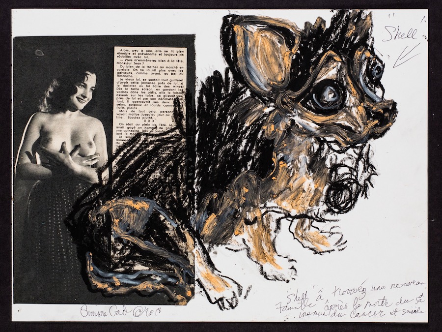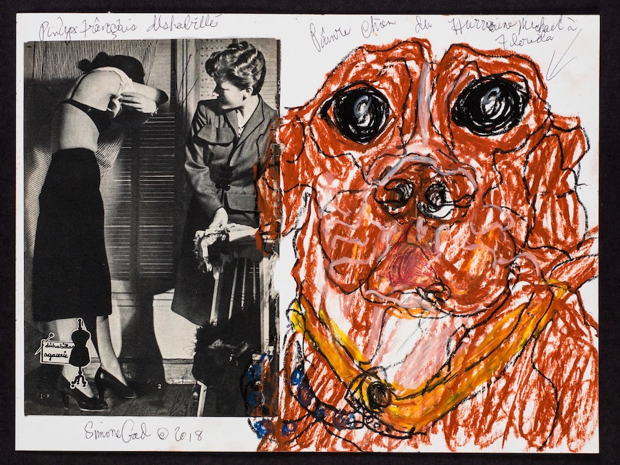 Self-taught artist Gad was born in Brussels but has lived in Los Angeles since her childhood, beginning a career as an actress, but also working as a painter, performance artist, and creator of assemblages and collages for over 50 years. At Track 16, Gad has hung beautiful, haunting collages with oil pastels as well as a series of lush paintings on display. Her thickly textured acrylic paintings are somewhat amorphous in meaning, both patterned and dream-like abstracts whose subjects are architectural in nature. Her collages, however, are somehow both sorrowful, touching, and playful combinations of images, rescued animals overlaid on vintage nude pinups, beautifully expressing ideas of both vulnerability and rescue.