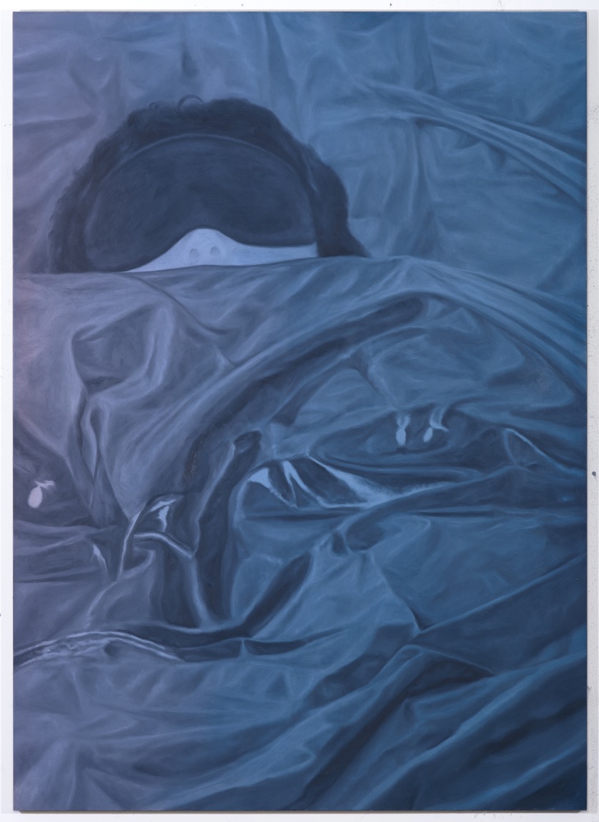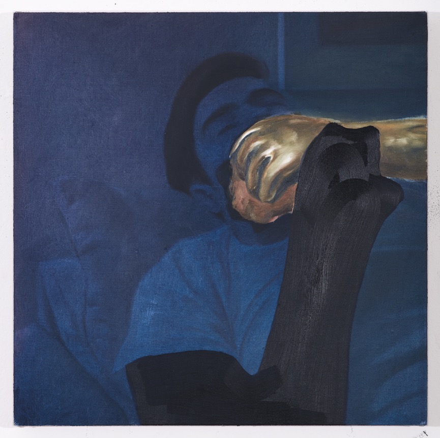 This space between dreams and reality is explicitly explored in two prominent paintings in this show, One of these days, I’ll do it (2017) and Carmen Asleep (2017). In the former, we see a disembodied hand reach out to smother a sleeping man. Here, it likely refers to the act of killing and the audience does not know if this is just a dream, a depiction of a repressed desire, or if this murder is actually happening. The relaxing periwinkle fog on top of this image aids in this confusion and continues into Carmen. In this frightening painting, the viewer sees the titular character fast asleep. She is wearing an eye mask and has the covers pulled up to her nose. There is no obvious murder attempt here, but the subject is vulnerable as she is unconscious. Also, her sleeping mask further restricts her ability to see a possible attacker, leaving her quite helpless. In addition, this portrait itself is quite intrusive as Carmen is likely somnolent and we do not know the relationship between the subject and the artist. However, this painting could just be a peaceful representation of the subject’s trust in her surroundings. The ambient periwinkle light seen in these paintings does also play into this sense of tranquility.