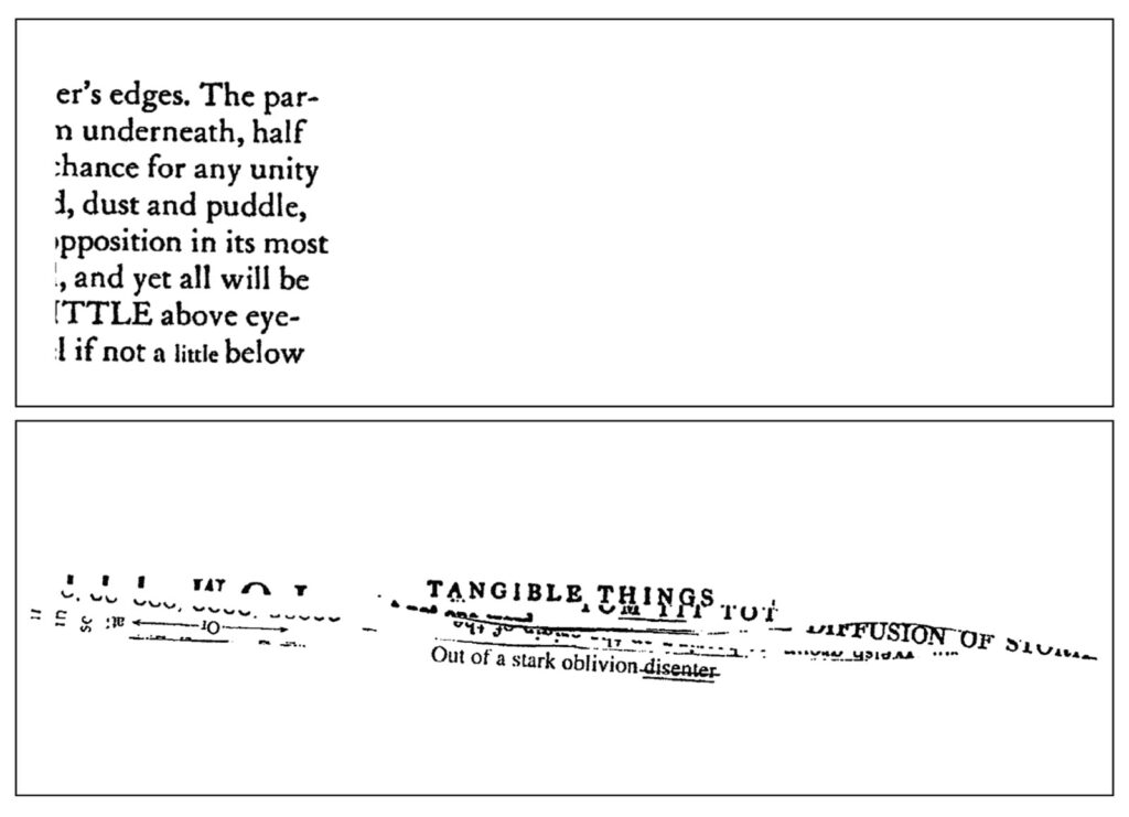 What is Howe saying with her scissors, tape, photocopy, and white paper? Well, the subject is central to her poetics: “edges.” Influenced by the “cuts” in cinematic montage and collage art, Howe’s poetry alters perception by disrupting syntax and grammar. That technique is extended here to cutting up words themselves to see what’s inside or “underneath” them. What we find are parts—halves, not wholes—or simply “dust and puddle.” This leaves Howe’s writing on the edge of intelligibility and even legibility. There can be no “chance for any unity” in such poetry. The most it can do is put up “opposition” to the regimes of power that maintain the order of the world, asserting contradiction and division in place of unity and its false consolations.