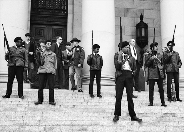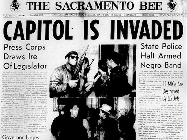 The question, then, at this point in our nation’s history, is have we arrived at another Panther moment, or an Athens moment, where the line in the dirt has been drawn and the gauntlet thrown? That line, thinking back on the Black Panthers, was notably crossed when they stormed the Reagan-occupied statehouse with shotguns and rifles in an effort to dramatize their constitutional right to bear arms and, more importantly, demand their continued right to defend against what they legitimately saw as racist and openly hostile state and national regimes. This was a demonstration, a protest, not an assault.