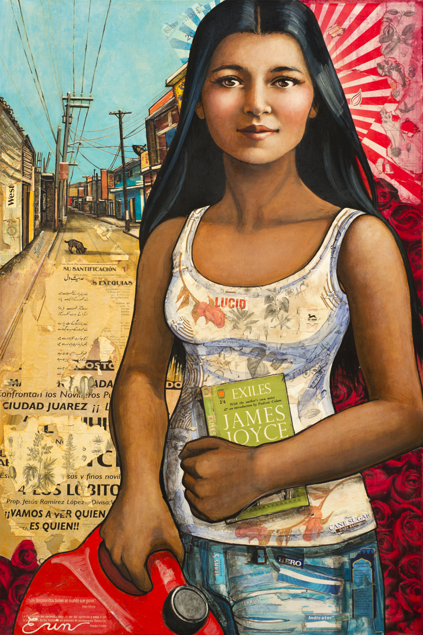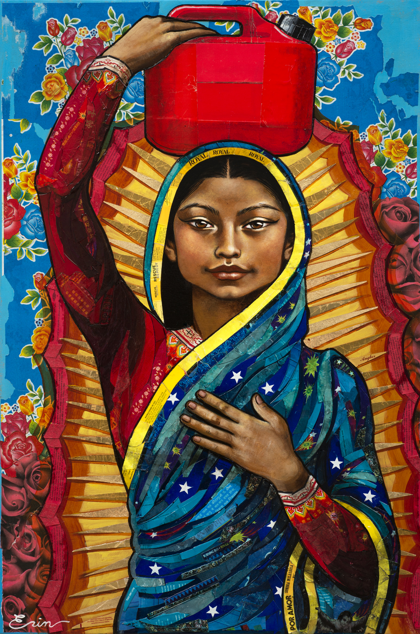 CURRIER: These works are from various series created through the years. However, all share in common the fact that each one is either a direct or symbolic representation of those engaged in the international struggle for social justice, be it of individuals such as Teresita Urrea, Saint Philomena, Kwame Toure, Bobby Seale, Lila Downs, or be it groups of people: Indigenous women from both sides of the US-Mexico border, Greek schoolboys, Egyptian schoolgirls, young Ukrainian feminists.