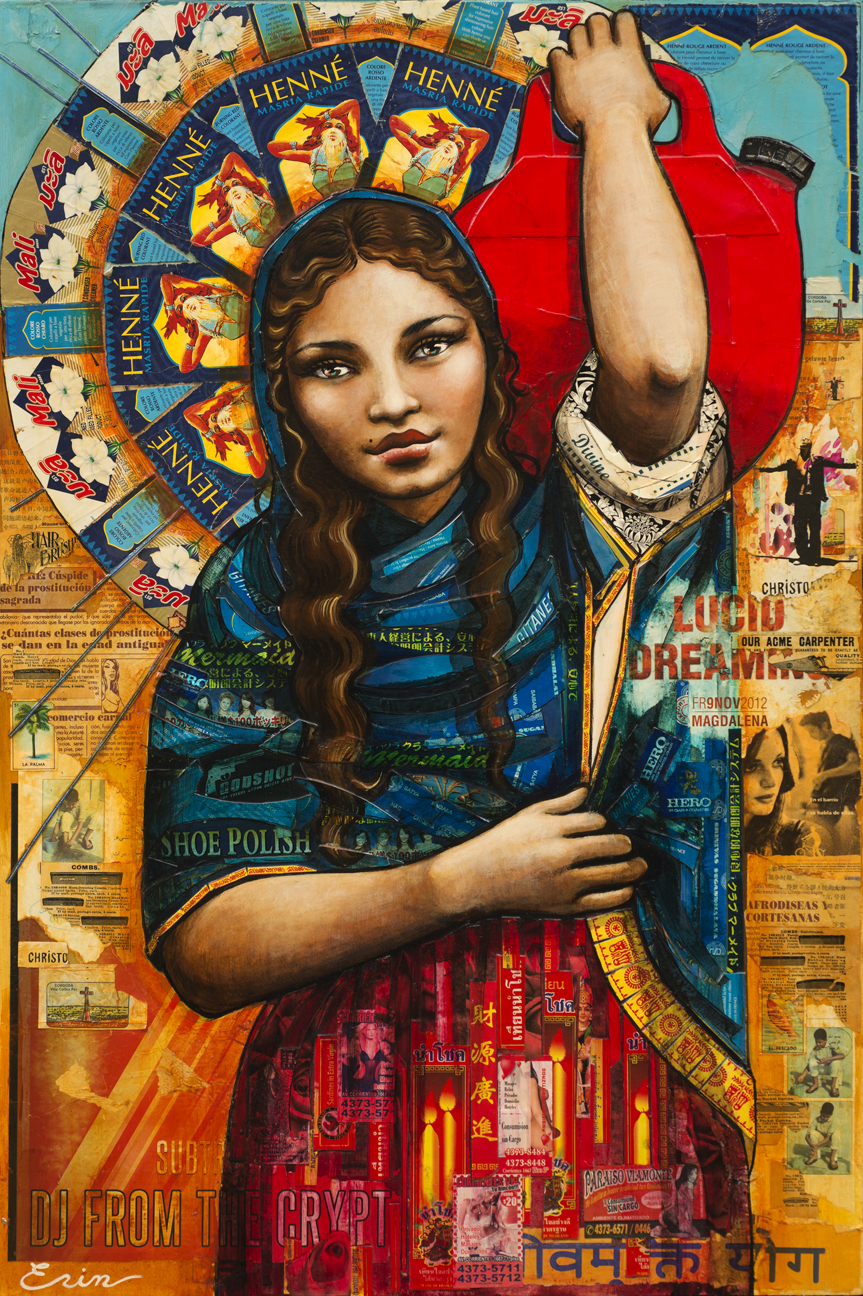ERIN CURRIER: For the past decade and a half, the underlying theme of all of my work is that which I continue to find to be true wherever I have traveled, be it Latin America, Africa, the Middle East, Asia, or Europe: that our commonalities as human beings far outweigh our differences. The overwhelming majority of people I have met all over the world are kind, decent human beings whose needs and desires are simple and universal: the necessity of adequate shelter, good food, clean water, the ability to raise and provide for a family, and the opportunity to make use of one’s particular set of skills in order to contribute to their larger communities. Divisions are often either superficial or artificially created based on racial, economic, and national ideologies. Where we are similar is of a more profound metaphysical caliber: the bond between brothers, the love between mother and child, the kinships shared through creative endeavors; these run like threads in the great fabric of generations. My use of trash and discarded packaging, written in every language, gathered from every continent, further expresses our affinities in what we create, value, share, consume, and cast away.