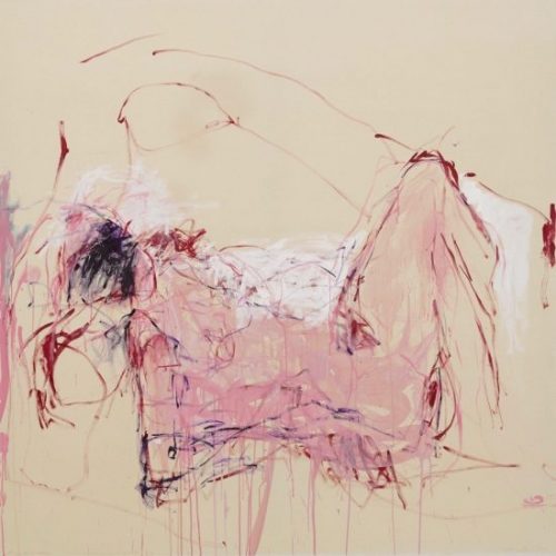 In a painting such as It was all too Much (2018) the colour palette is mainly confined to pinks and reds, where a gestural weave of lines is suggestive of a naked figure in some sort of sexual distress. Where the figure’s head is painted, a coarse black and purple scribble erupts, as if the face has been redacted by emotional necessity.