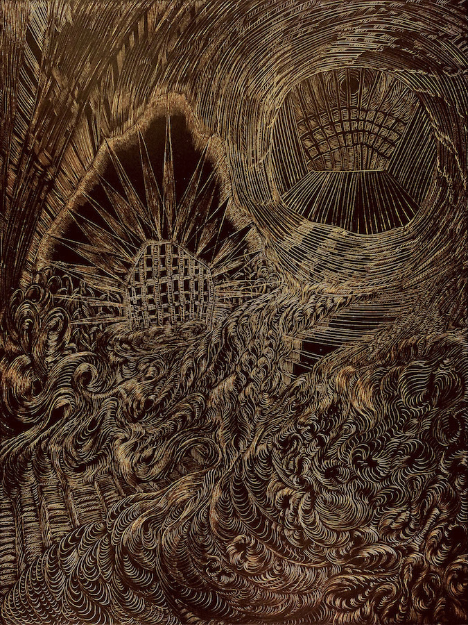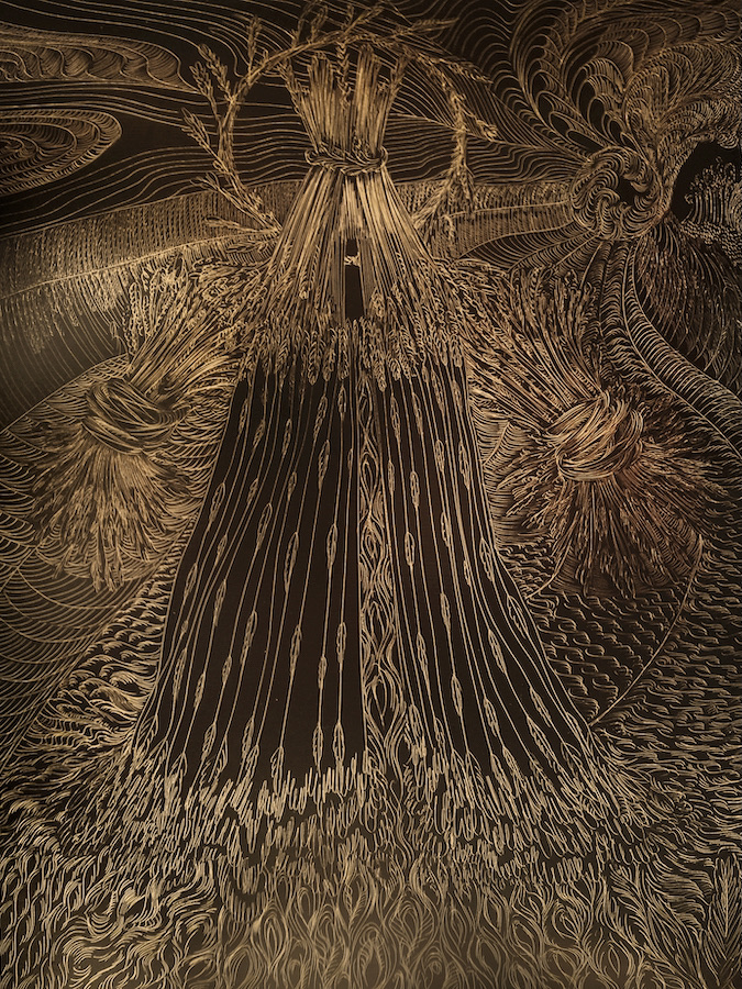 Working in ink on a variety of mediums, Cathy Ward shapes dreamy abstract shapes that resemble wisps and smoke. There is the swirling, watery substance of delicate ink on clay in “Land of Promise,” and the lush harvest of ink on gold in “Corn Maiden.” These are luminous works traversing the surreal and sensual land of the unconscious mind.