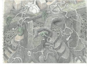 HALL: I get a kick out of that, yeah. A lot of people seem to like it. I guess it’s different. Nobody does this anymore, this type of drawing. I guess Gustave Doré did it, but that was a hundred years ago. Most people are into something different. But it’s in my genetics. My grandfather’s brother (Percy Hall) was an engraver. He did the first Aunt Jemima on the package. (My family) are all from the UK. They were in Virginia…one of the first families in Virginia. Long time ago. Lord Byron is related. That’s why mother has the ability to write poetry. I just happened to know all along, (that I wanted to make art). Everybody was into it, so I said, “Ok, I’ll do it too, then.” But you don’t always have the time to do this kind of work. But I’m used to it.