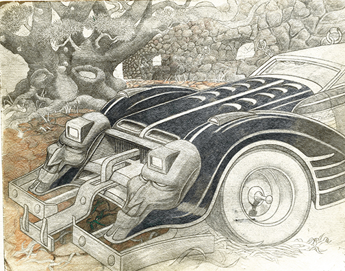 HALL: I love anything. I like to do figure work. I can change over into just about anything. You can get in a rut over that sort of thing. I’ve done plant environments. I drew a whole a bunch of them, twenty or thirty of them and then I’d go back to the cars. Right now I’m still on cars. You get on kind of a rampage. I like to do a lot of that and then you get tired of that and you go onto another form.
