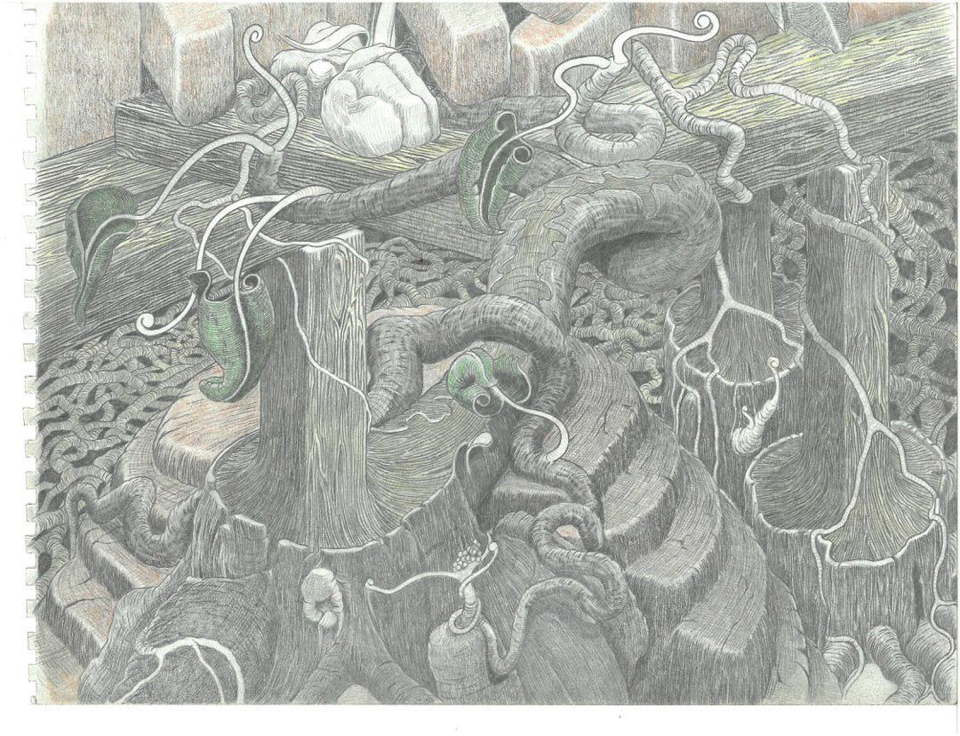When Hall lived in his car he used the steering wheel as his easel and the close quarters limited the size of paper he could use. To make larger drawings, he devised a method using multiple sheets that could be assembled afterwards. He didn’t see them fully assembled until Holman put them together years later.