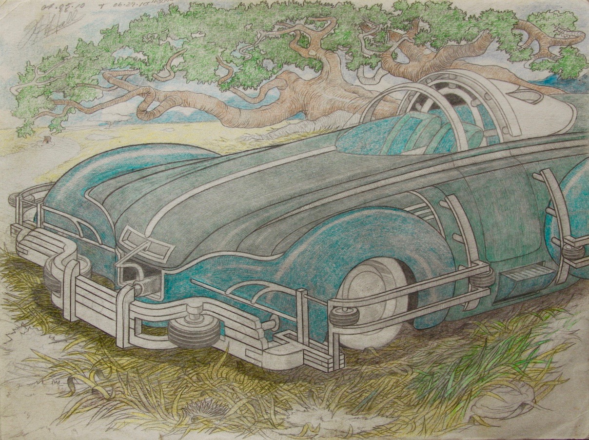 Hall’s work, made with colored pencils, crayons and occasionally watercolors, are complex, fastidious drawings. His line work is focused and intense, but at the same time, delicate and subtle, partly due to the limitations of his materials and partly to his innate modesty. He often works in series, as if to satisfy a compulsion, whether his subjects are cars, inventions or landscapes. The cars, in particular, are curious things. They have the dated, futuristic quality of 1950’s sci-fi inventions; all rounded and outfitted with streamlined safety features. Like all his work, they are lovingly conjured from his imagination. Rich and mysterious, Hall’s artwork usually lack people, but altogether they tell a story that is as remarkable and solitary as his life.